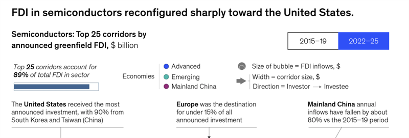 According to a McKinsey projection and industry data, the U.S. semiconductor sector is growing faster than any other region in the world. A chart titled “Semiconductors: Top 25 corridors by announced greenfield FDI, $ billion” also highlights how the U.S. has become the dominant destination for semiconductor FDI between 2022 and 2025.