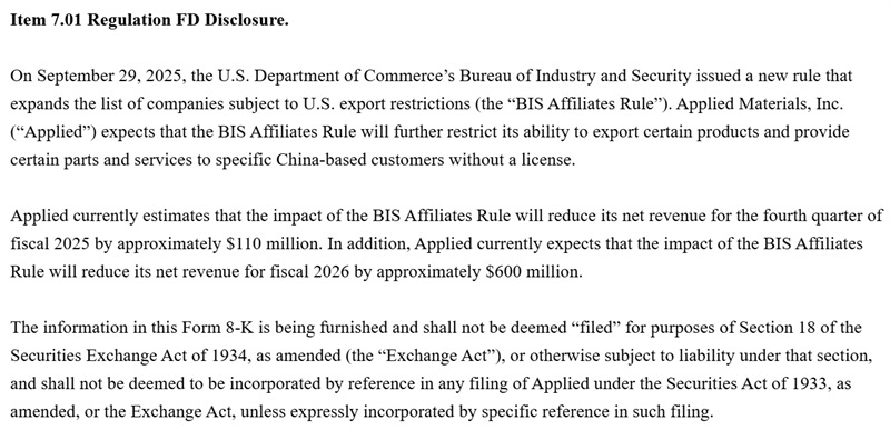 On October 2 local time, Applied Materials, one of the world's largest semiconductor equipment makers, disclosed in an SEC 8-K filing that new export restrictions issued by the U.S. Department of Commerce's Bureau of Industry and Security (BIS) could cut its revenue by approximately $110 million in the fourth quarter of fiscal 2025 and $600 million in fiscal 2026.