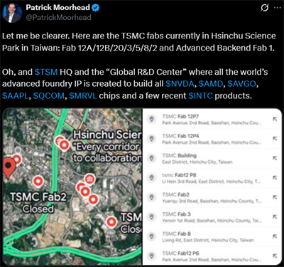 Patrick Moorhead, CEO and chief analyst at U.S. research firm Moor Insights & Strategy, reposted the satellite images and issued a stark reminder of Hsinchu's importance. "Let me be clear," he wrote, listing TSMC's Fabs 12A, 12B, 20, 3, 5, 8 and 2, as well as its Advanced Backend Fab 1 and Global R&D Center, "where all the world's advanced foundry IP is created." Chips designed for Nvidia, AMD, Apple, Qualcomm and even some of Intel's recent products originate from this small stretch of land, he emphasized.