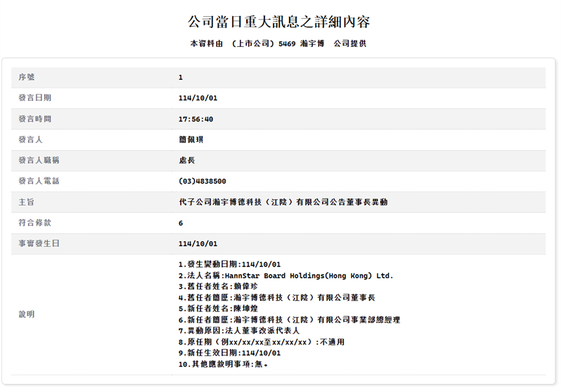 According to the company's filing, Chen Kun-Huang, formerly General Manager of the Jiangyin division, has been appointed as Chairman, succeeding Lai Wei-Zhen. The change took effect on October 1, 2025, following a representative adjustment by the subsidiary's corporate director, HannStar Board Holdings (Hong Kong) Ltd.