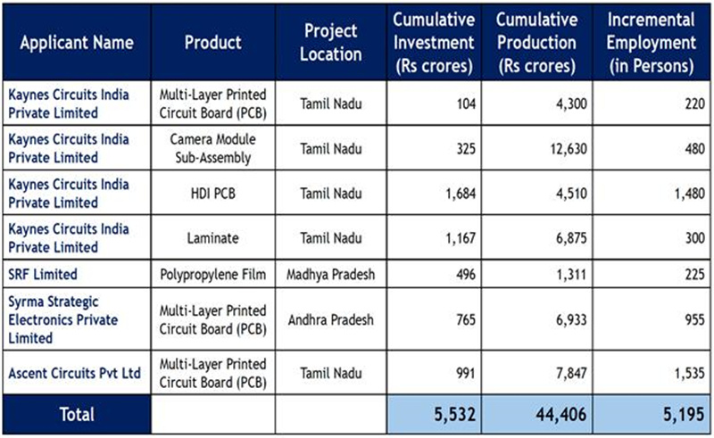 The seven approved projects include the establishment of new manufacturing units for High-Density Interconnect (HDI) PCBs, multi-layer PCBs, camera modules, copper clad laminates, and polypropylene films.