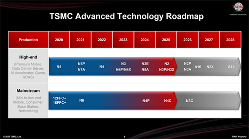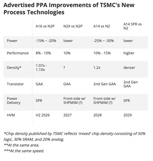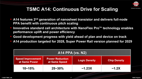 At the company's North America Technology Symposium earlier this year, TSMC outlined the technical roadmap for its A14 process, describing it as "a full-node advancement" over its N2 technology. The A14 process will use TSMC's second-generation gate-all-around (GAA) nanosheet transistors combined with NanoFlex Pro design technology to achieve up to 15% faster performance, 30% lower power consumption, and 20–23% higher transistor density compared with N2.
